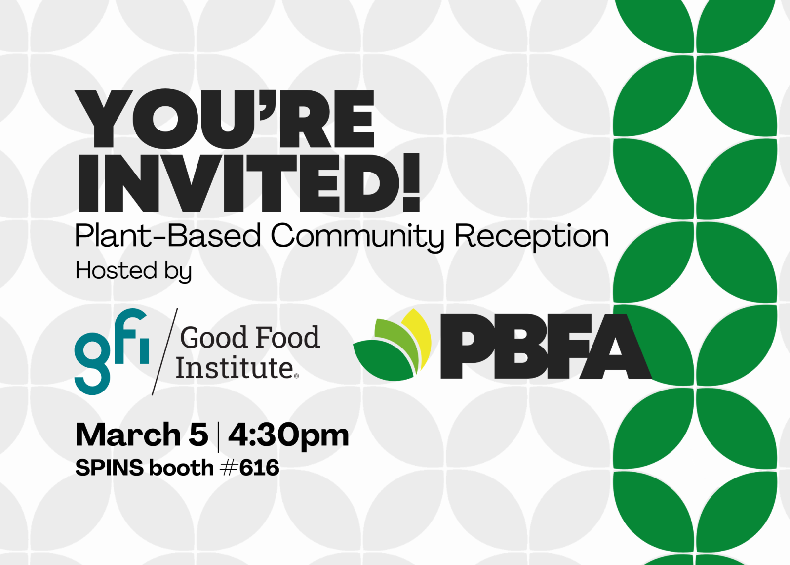 Join the Good Food Institute (GFI) and the Plant Based Foods Association (PBFA) at the SPINS booth #616 for a Plant-Based Community Reception at 4:30pm on Thursday, March 5.